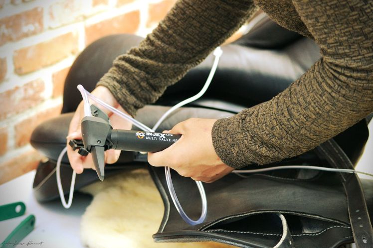 Pendant l’essai (et ce qui est complètement dingue en réalité), l’ajustement des panneaux se fait en selle (!) : pas besoin de descendre de cheval, pas besoin non d’ouvrir la selle pour mettre une cale ou de la laine et encore moins d’envoyer la selle à l’atelier. Ça c’est quand un même un truc de fou !
